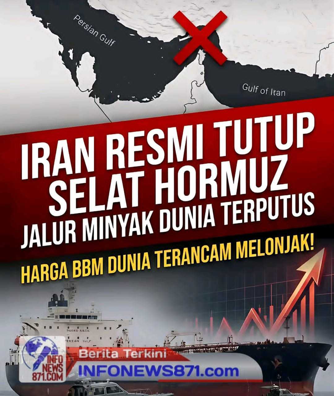 Tak Cukup di Medan Tempur, Iran mengeluarkan Senjata Ekonomi Paling mematikan, Menutup Selat Hormuz Jalur Air paling Vital yang mengalirkan 30% Pasokan Minyak Dunia ini kini Resmi di Blokade oleh Militer Iran. Efeknya Harga Minyak Mentah Dunia langsung meroket tajam jika Blokade ini terus berlanjut, Krisis Energi Global tidak terhindarkan, dan Harga BBM di seluruh Dunia, termasuk Indonesia terancam melonjak drastis. Situasi Timur Tengah kini berasa di Titik didih, akankah Amerika Serikat menyerang balik lebih Besar.?