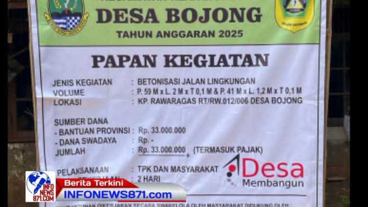 Kepala Desa Bojong (Ade Nurdiana) Mengatakan, Untuk Kegiatan Betonisasi Dengan Anggaran Bantuan Provinsi Desa Bojong telah Melakukan Betonisasi di wilayah Kp. Rawaragas RT 12 RW 06 Desa Bojong kecamatan klapanunggal.